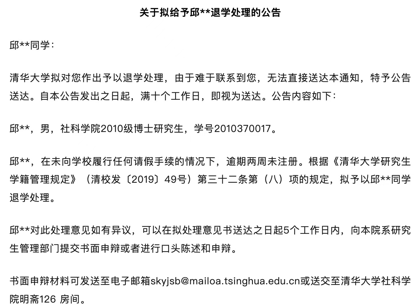 近日,清华大学社会科学学院官网发布的两则公告,激励了不少东谈主的关注和盘考。公告披露,校方筹谋对两名经久失联的博士生作出退学处理,其中别称2010级入学的邱同学,在读工夫也曾长达16年,另别称2013级的吴同学,也已就读13年。