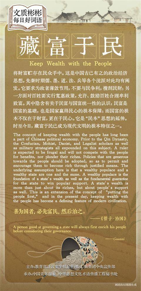The concept of keeping wealth with the people has long been a part of Chinese political economy. Prior to the Qin Dynasty, the Confucian, Mohist, Daoist, and Legalist scholars as well as military strategists all expounded on this subject. A ruler is expected to be frugal and will not compete with the people for benefits, nor plunder their riches. Policies that are generous towards the people should be adopted开云·综合体育(kaiyun), so as to permit and encourage them to become rich through justified means. The underlying assumption here is that a wealthy populace and a wealthy state are one and the same. A wealthy populace is the foundation of a state's wealth as well as the fundamental guarantee for the state to win popular support. A state's wealth is more than just about its riches, but about people's support as well. This is an extension of the concept of "putting the people first