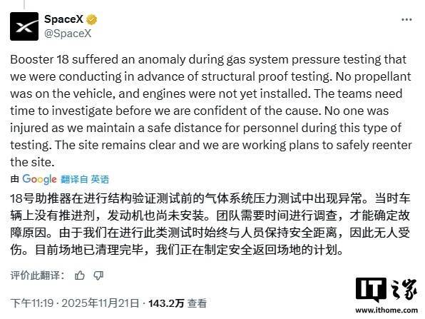 B18 助推器在开展结构强度考证锤真金不怕火前的气体系统压力测试历程中发生极端。其时遨游器上无鼓舞剂,发动机亦尚未装配。当今团队尚需时分开展探访,以明确事故原因。测试技艺,咱们持久确保东谈主员处于安全距离,因此无东谈主员受伤。现场当今情景可控,咱们正制定决议,以确保东谈主员安全重返锤真金不怕火区域。